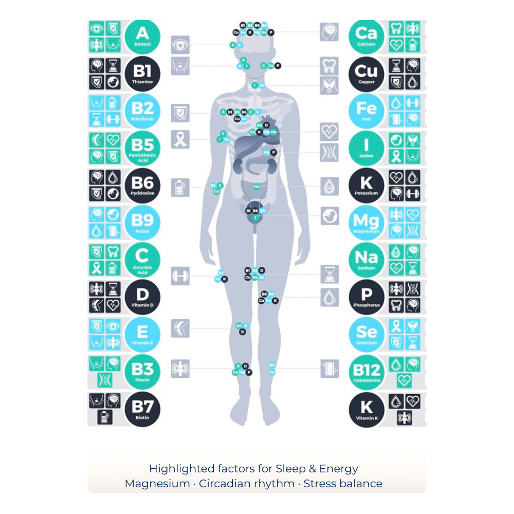 Des schémas de distribution des micronutriments impliqués dans la détente neuromusculaire et le soutien de la production énergétique mitochondriale.
